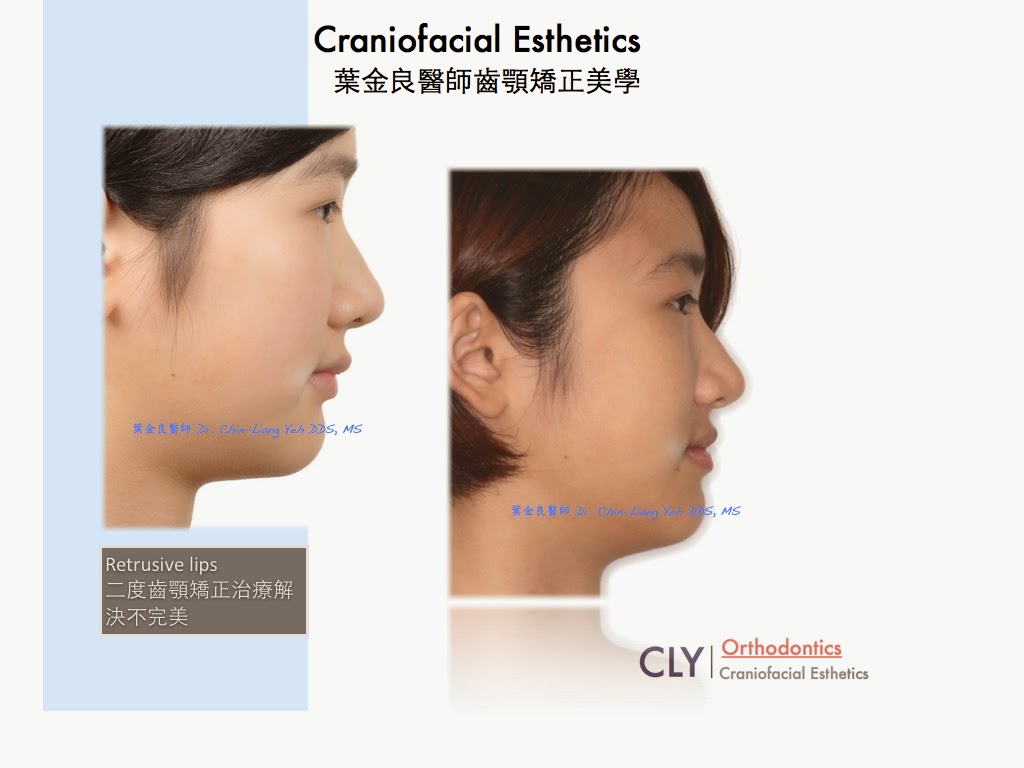她的問題出在第一,唇型過凹,事實上應該是和其他大部分東方人不同的,將牙齒往外移動,以得到更好的軟組織支持。這事實上發生在很多白人(高加索人種),或是已經因為臉部軟組織下垂失去彈性的老年人而採用的治療原則。