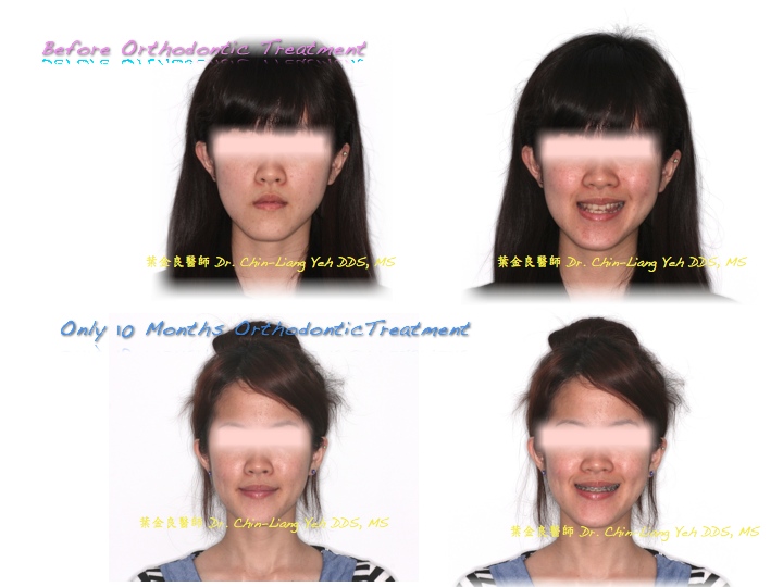 In the following case, the severe dentition almost makes the lateral incisors "invisible". Almost most orthodontists will choose extraction to have the easier result. However, I did not extract any tooth in order to make the front teeth forward to have the fullness of upper lip. To push the lower anterior teeth backward, to have the more balance and symmetrical face.