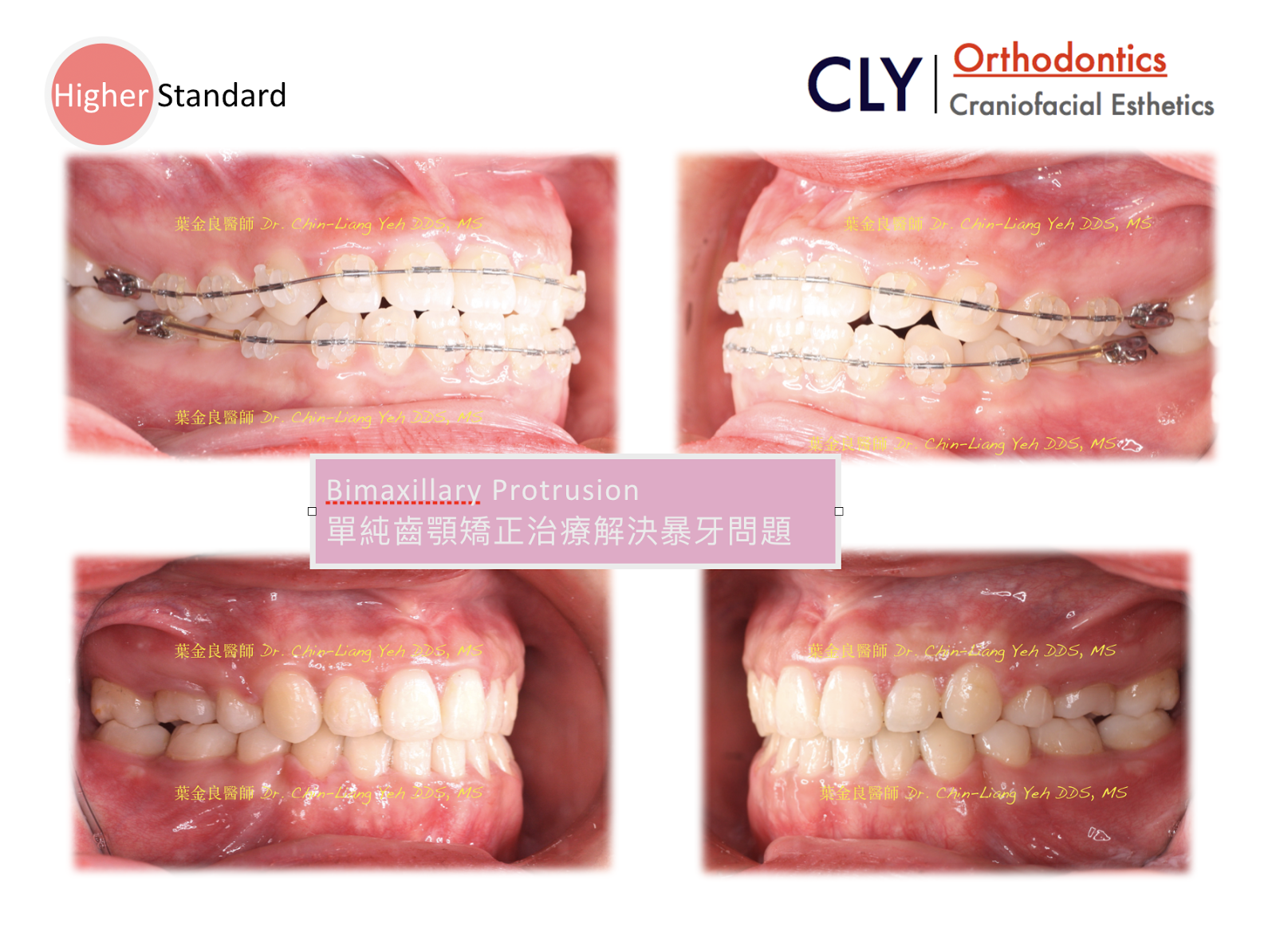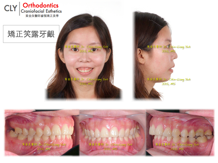 牙齦外露一直是矯正治療中的難症,有許多的患者因為尋求單靠矯正來解決該問題,而慘遭醫師拒絕。笑起來露牙齦的原因有許多,舉例來說上顎骨垂直的高度過長,和骨骼過於突出是主因。所以矯正治療中需要拔除上顎小臼齒,以讓前牙後移。我們利用迷你骨釘作為錨定作用,以讓上顎牙齒上移,並輔以牙周手術,去除過多的牙肉以讓牙齒形態更為完美。
