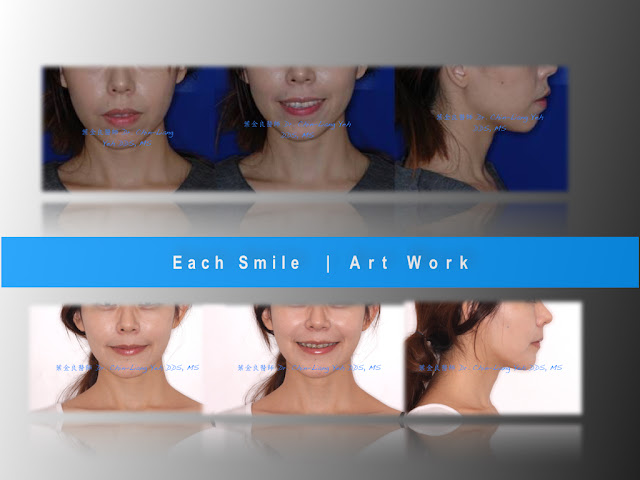 本案例歷經近三年的矯正期,時間雖久,但齒列狀態絕非停滯不動,而是我們為了好看的顏面曲線,不斷改進,讓齒列移動了超乎想像的距離。因為齒列矯正後的位置,對於美觀的感受,這樣的『擴大效應』,絕非當代3D系統,或任何高單價的矯正商品,所能比擬!當臉部放鬆,雙唇肌肉能自動閉合,鼻唇之間的角度放大後,自然形成直挺的鼻型。下顏面的輪廓,因為下排牙齒的後移,讓下巴的形體更為獨立,猶如創作畫作般,沒有混搭錯誤的低俗感,簡約的線條,讓原本就高雅的個性自然顯露無遺。微笑時的空間表情,讓患者彷彿像蛻變般,走出畫作。