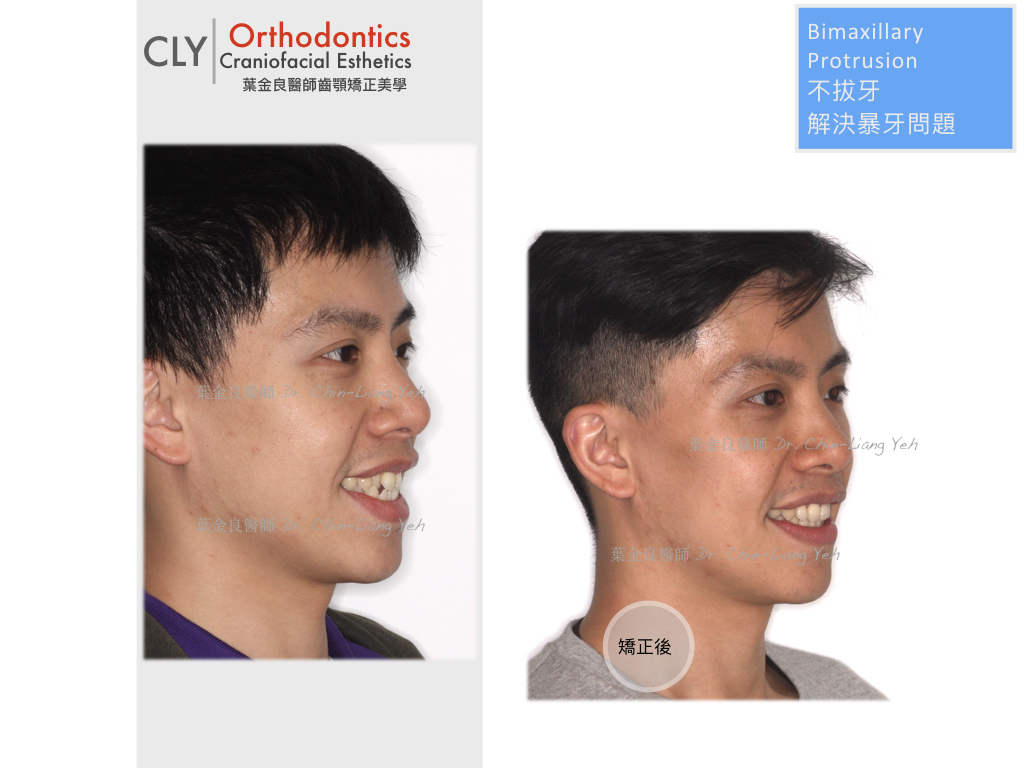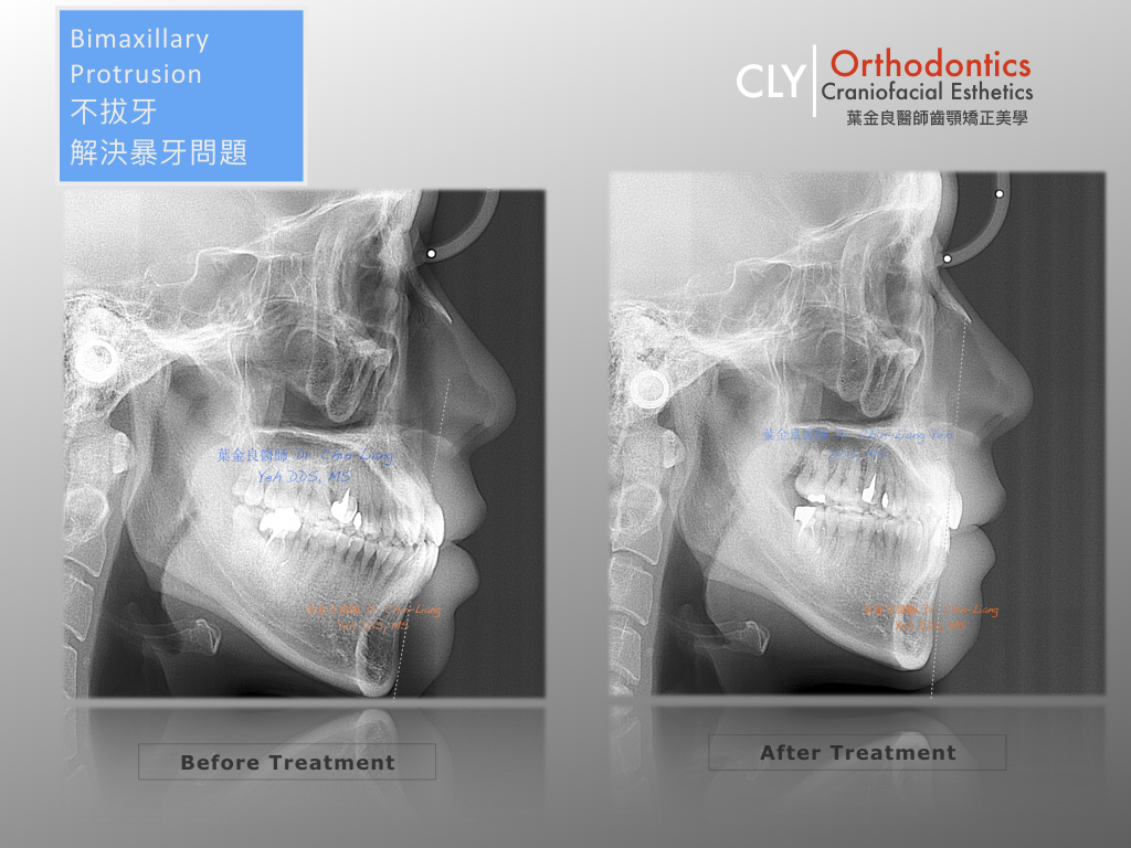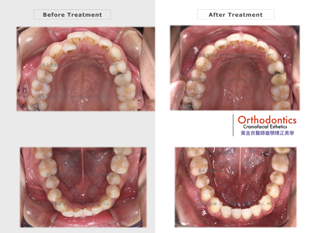 在17個月的矯正治療中,除了解決不整齊的上下齒列外,必須將上下牙齒中線排對齊,原本藏在齒列內的牙齒拉出外。原本閉不起來的嘴唇,經由咬合平面的改正,讓它適度向前及向上移動,矯正時期咀嚼肌肉的改變,也讓臉型有變尖的感覺。